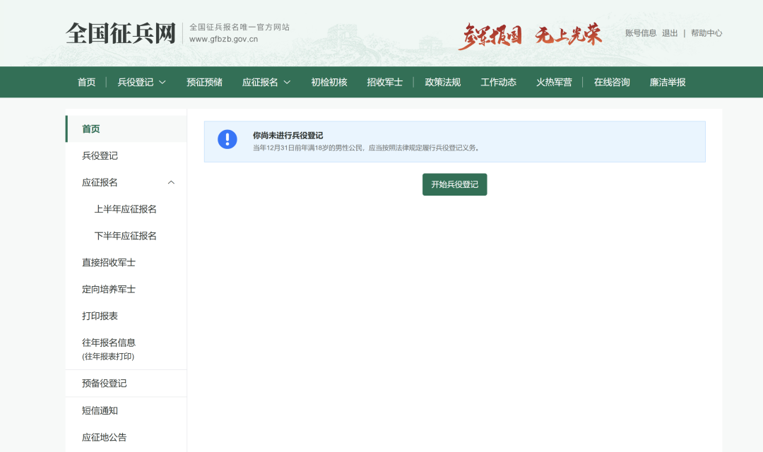 登陸學信網帳號以后,自動跳轉到【開始兵役登記】頁面,點擊【開始兵役登記】。